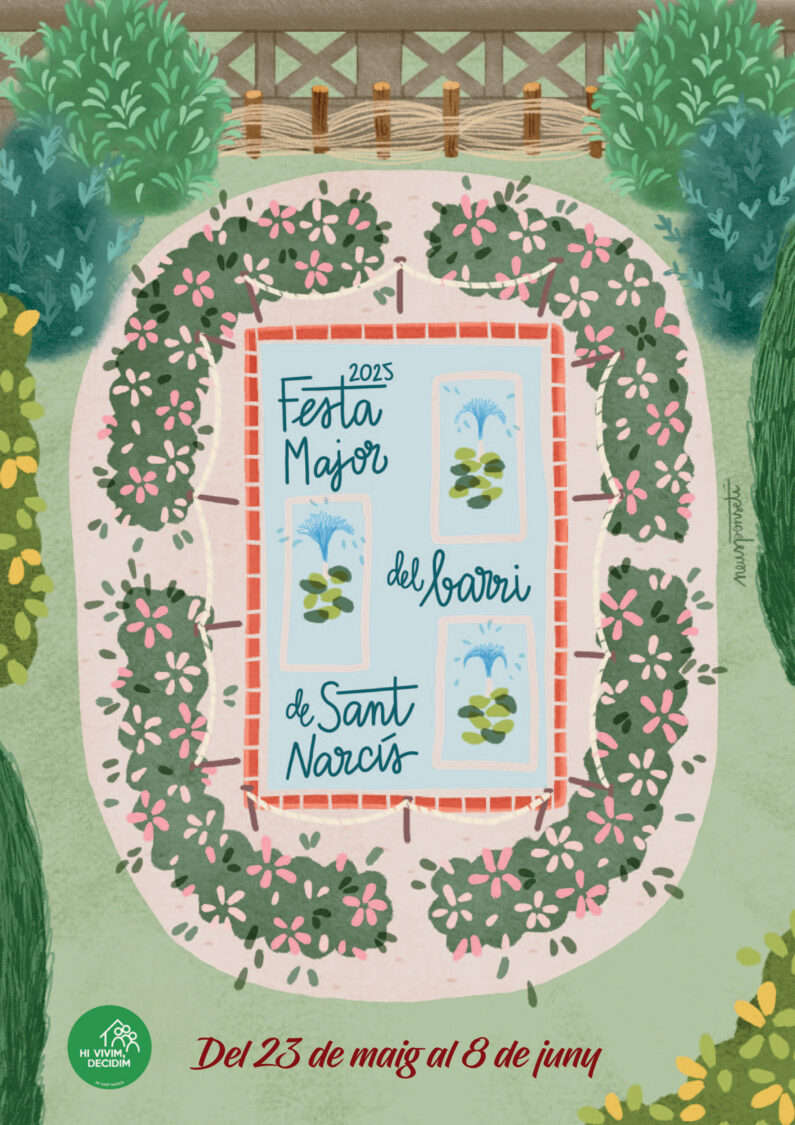El cartell de la Festa Major 2025 del Barri de Sant Narcís està inspirat en la plaça de l’Assumpció, un lloc de trobada per a famílies, veïns i visitants del barri, on se celebren moltes de les activitats de la festa major, com els sopars populars i les fires.